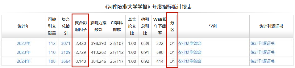 在收录的农业科学综合学科领域117种期刊中,《河南农业大学学报》连续4年位居Q1区。复合类影响因子和综合类影响因子等各项指标均持续稳步提升。其中,2025版复合类影响因子为3.140,相较上一年提高15.06%;综合类影响因子为1.901,相较上一年提高1.54%。