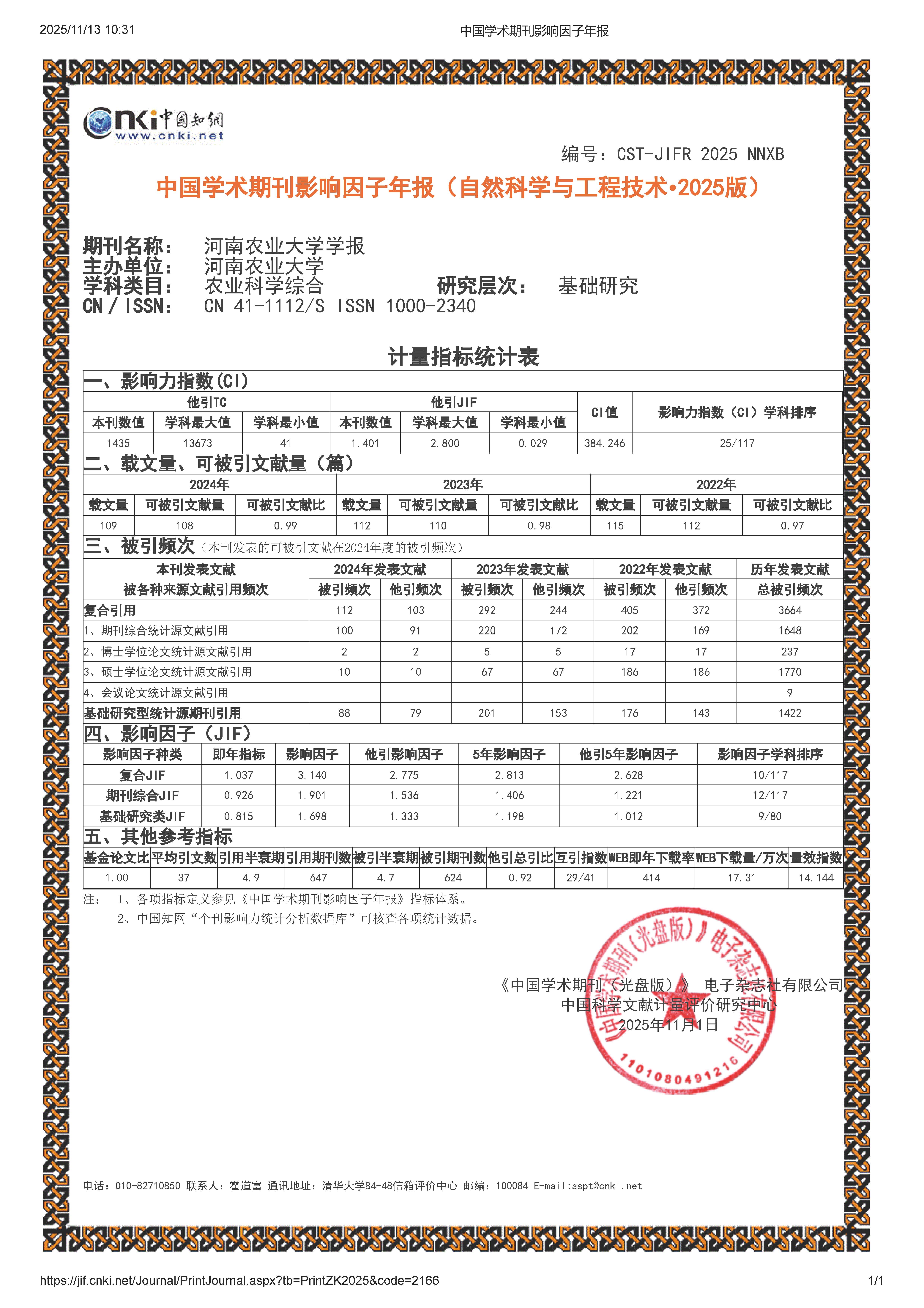 2025年11月,中国知网发布《中国学术期刊影响因子年报》(自然科学与工程技术・2025版),《河南农业大学学报》再次入选。